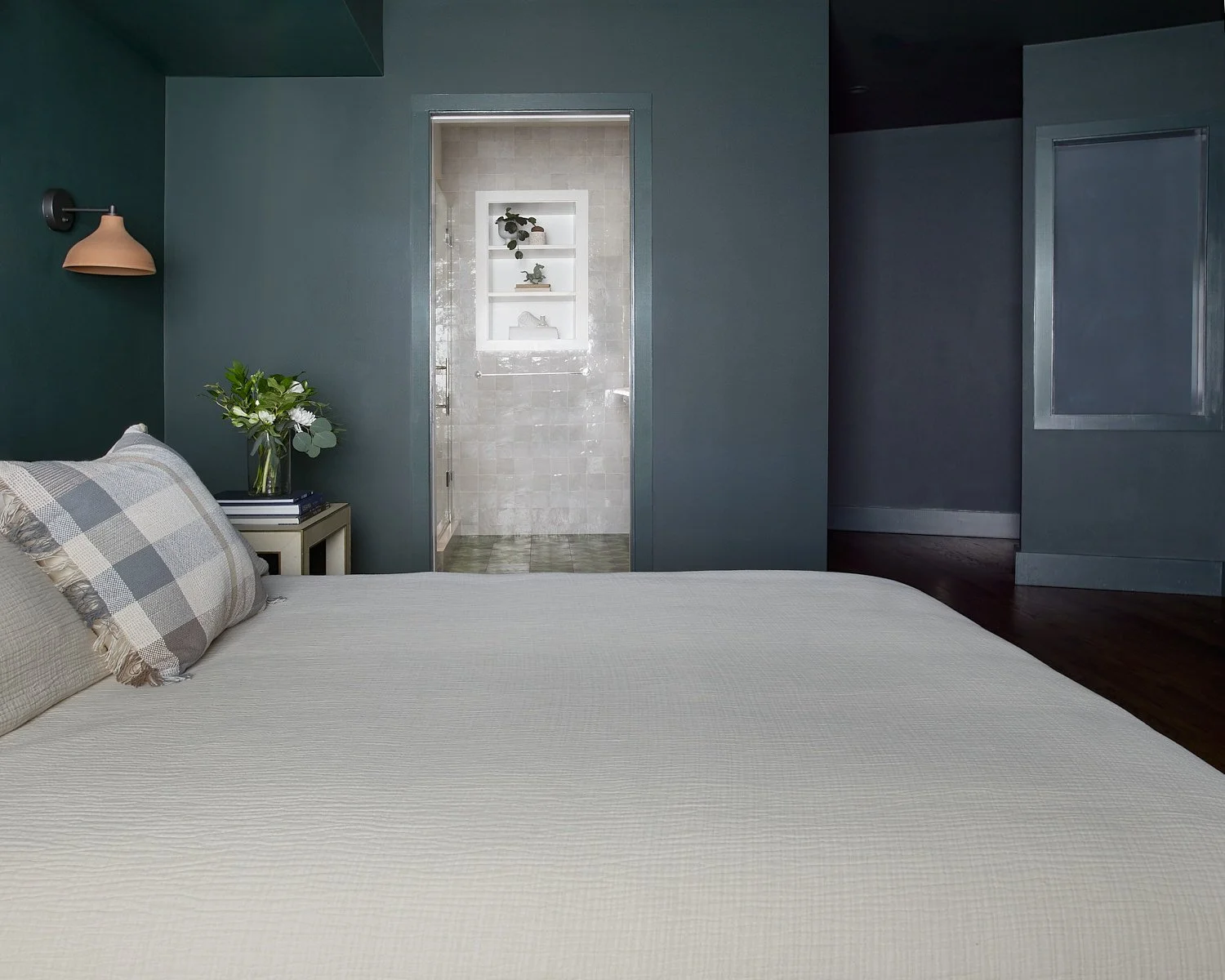 We renovated the guest bedroom and bathroom to create a sanctuary inspired by Moroccan hammams. The deep green walls and walnut-stained floors of the bedroom create a cocooning sense of comfort, while hints of gold and color in the sconces and bedside tables add a touch of quiet luxury and visual interest.